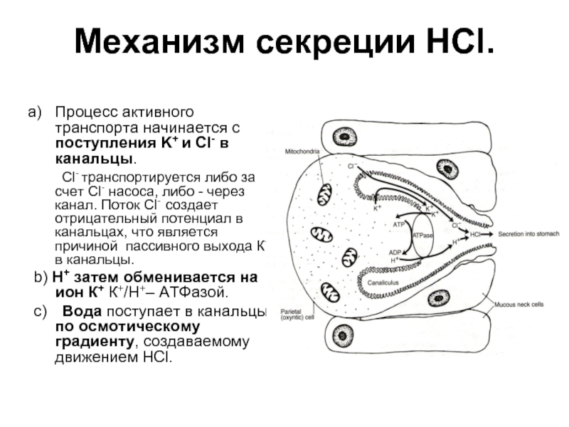 Cl- транспортируется либо за счет Cl- насоса, либо - через канал. Поток Cl- создает отрицательный потенциал в канальцах, что является причиной пассивного выхода К+ в канальцы.