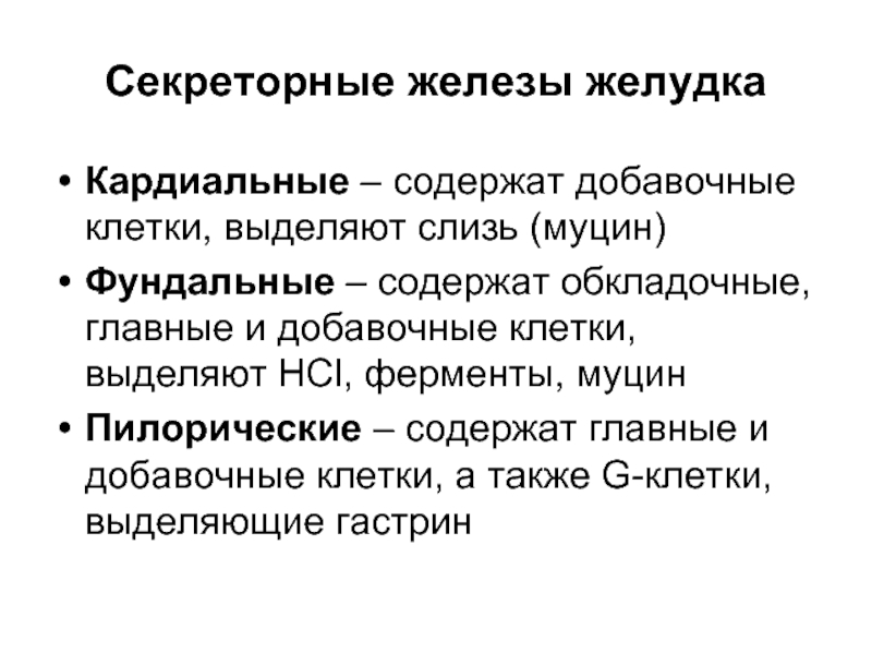 содержат обкладочные, главные и добавочные клетки, выделяют HCl, ферменты, муцин
