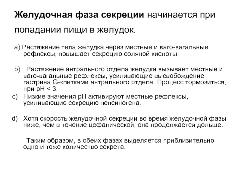 b) Растяжение антрального отдела желудка вызывает местные и ваго-вагальные рефлексы, усиливающие высвобождение гастрина G-клетками антрального отдела. Процесс тормозиться, при рН < 3.