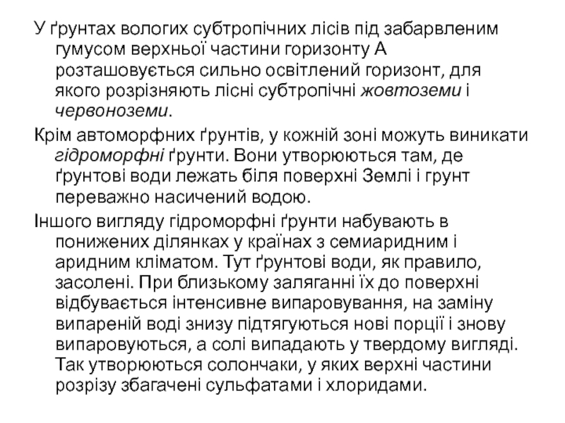 Слайд 9У ґрунтах вологих субтропічних лісів під забарвленим гумусом верхньої частини горизонту
