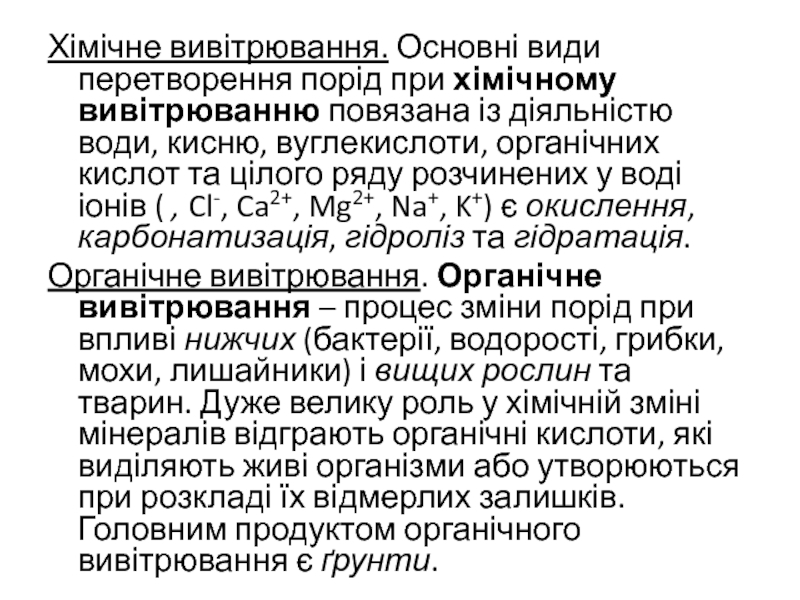 діяльністю води, кисню, вуглекислоти, органічних кислот та цілого ряду розчинених у воді іонів ( , Cl-, Ca2+, Mg2+, Na+, K+) є окислення, карбонатизація, гідроліз та гідратація.