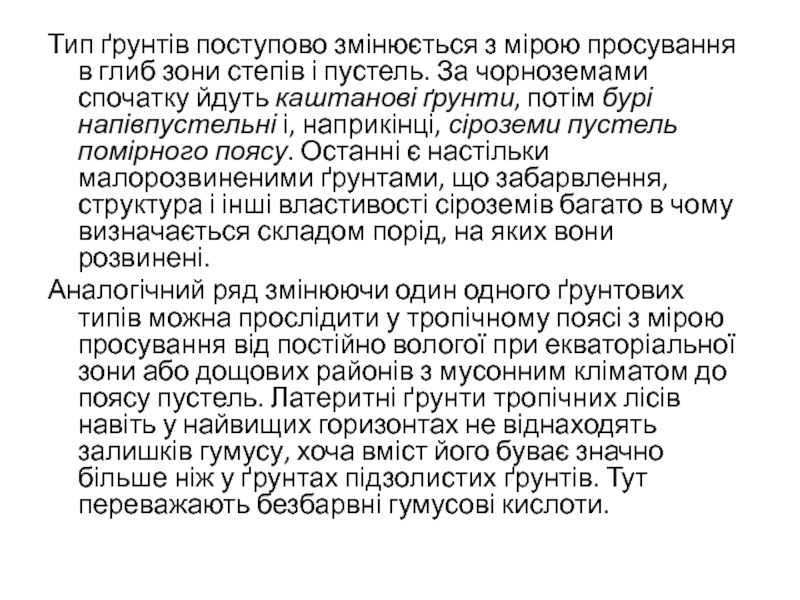 Аналогічний ряд змінюючи один одного ґрунтових типів можна прослідити у тропічному поясі з мірою просування від постійно вологої при екваторіальної зони або дощових районів з мусонним кліматом до поясу пустель. Латеритні ґрунти тропічних лісів навіть у найвищих горизонтах не віднаходять залишків гумусу, хоча вміст його буває значно більше ніж у ґрунтах підзолистих ґрунтів. Тут переважають безбарвні гумусові кислоти.