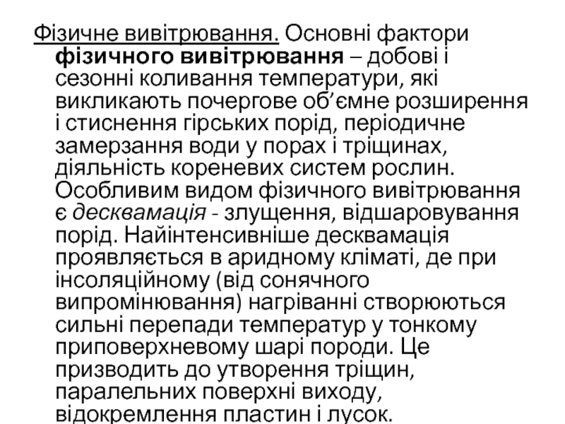 температури, які викликають почергове об’ємне розширення і стиснення гірських порід, періодичне замерзання води у порах і тріщинах, діяльність кореневих систем рослин. Особливим видом фізичного вивітрювання є десквамація - злущення, відшаровування порід. Найінтенсивніше десквамація проявляється в аридному кліматі, де при інсоляційному (від сонячного випромінювання) нагріванні створюються сильні перепади температур у тонкому приповерхневому шарі породи. Це призводить до утворення тріщин, паралельних поверхні виходу, відокремлення пластин і лусок.