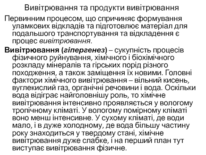 Вивітрювання (гіпергенез) – сукупність процесів фізичного руйнування, хімічного і біохімічного розкладу мінералів та гірських порід різного походження, а також заміщення їх новими. Головні фактори хімічного вивітрювання – вільний кисень, вуглекислий газ, органічні речовини і вода. Оскільки вода відіграє найголовнішу роль, то хімічне вивітрювання інтенсивно проявляється у вологому тропічному кліматі. У вологому помірному кліматі воно менш інтенсивне. У сухому кліматі, де води мало, і в дуже холодному, де вода більшу частину року знаходиться у твердому стані, хімічне вивітрювання дуже слабке, і на перший план тут виступає вивітрювання фізичне.