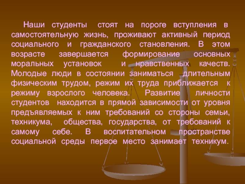 Слайд 2 Наши студенты стоят на пороге вступления в самостоятельную жизнь, проживают активный