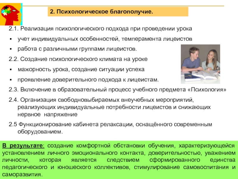 В результате: разработка четкой системы, реализация которой позволяет избежать нагрузки, выходящей за рамки адаптационных возможностей старшеклассников, что, в конечном итоге, создаёт комфортность обучения