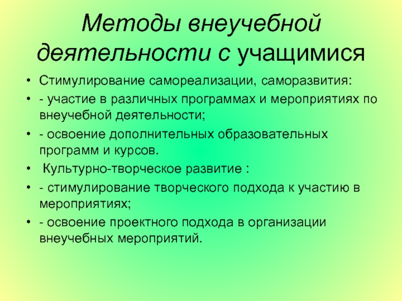 - освоение проектного подхода в организации внеучебных мероприятий.