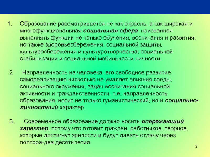 3. Современное образование должно носить опережающий характер, потому что готовит граждан, работников, творцов, которые достигнут зрелости и будут давать отдачу через полтора-два десятилетия.