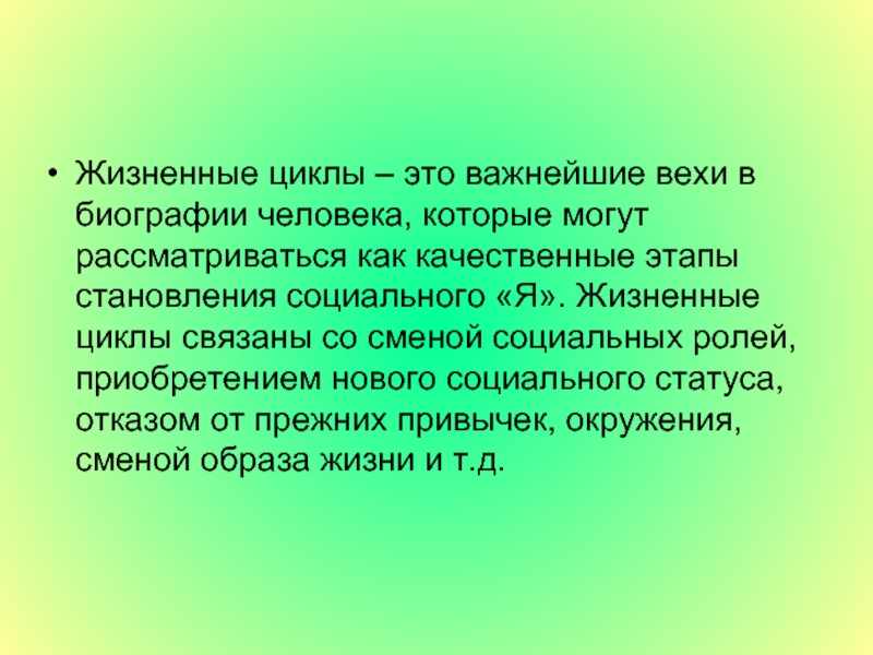 рассматриваться как качественные этапы становления социального «Я». Жизненные циклы связаны со сменой социальных ролей, приобретением нового социального статуса, отказом от прежних привычек, окружения, сменой образа жизни и т.д.