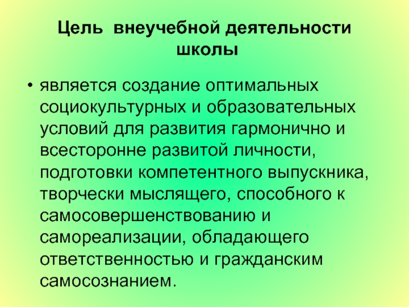 развития гармонично и всесторонне развитой личности, подготовки компетентного выпускника, творчески мыслящего, способного к самосовершенствованию и самореализации, обладающего ответственностью и гражданским самосознанием.