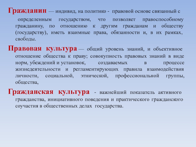 Слайд 4Гражданин — индивид, на политико - правовой основе связанный с