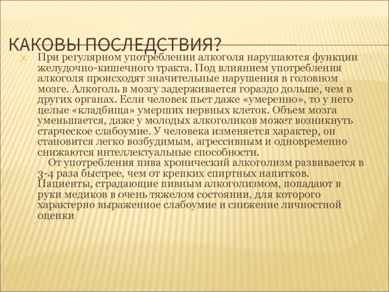 влиянием употребления алкоголя происходят значительные нарушения в головном мозге. Алкоголь в мозгу задерживается гораздо дольше, чем в других органах. Если человек пьет даже «умеренно», то у него целые «кладбища» умерших нервных клеток. Объем мозга уменьшается, даже у молодых алкоголиков может возникнуть старческое слабоумие. У человека изменяется характер, он становится легко возбудимым, агрессивным и одновременно снижаются интеллектуальные способности.