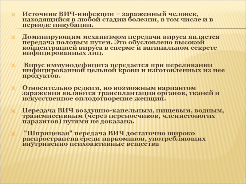 ВИЧ передается через кровь, сперму, влагалищные выделения и материнское молоко, но НЕ через другие жидкости организма (такие как слюна, пот, слезы, моча) и фекалии.
