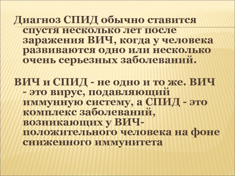 Диагноз "СПИД" обычно ставится спустя несколько лет после заражения ВИЧ, когда у человека развиваются одно или несколько серьезных заболеваний. Могут пройти годы, прежде чем человек заметит какие-то изменения в самочувствии, однако в течение всего этого периода он может заразить своего партнера.