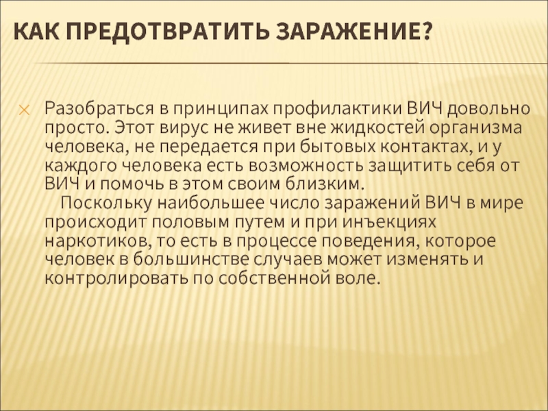 не живет вне жидкостей организма человека, не передается при бытовых контактах, и у каждого человека есть возможность защитить себя от ВИЧ и помочь в этом своим близким.