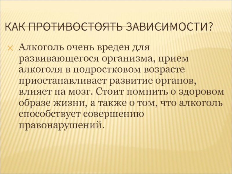 быть принятым в компанию значимых сверстников или ребят постарше, стремясь к самостоятельности, реагируя, как им кажется, на излишнюю опеку, стремясь показать себя и свою взрослость. Немаловажными причинами принятия алкоголя являются: неумение переносить стресс, справляться с неприятностями, плохое настроение, повышенная тревожность, выраженное стремление к получению удовольствий, новых ощущений при низком самоконтроле и при этом отсутствие умения доставлять себе удовольствие путем какой-то деятельности, требующей усилий, творчества. Алкогольная зависимость развивается на основе регулярного и длительного употребления алкоголя (злоупотребления) и характеризуется особым патологическим состоянием организма: неудержимым влечением к спиртному, изменением степени его переносимости и деградацией личности