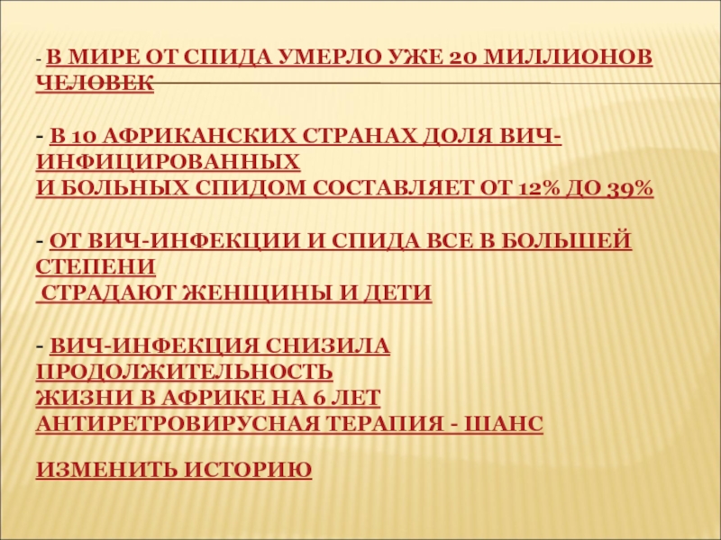 Слайд 61- В МИРЕ ОТ СПИДА УМЕРЛО УЖЕ 20 МИЛЛИОНОВ ЧЕЛОВЕК