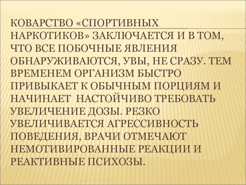 Слайд 74КОВАРСТВО «СПОРТИВНЫХ НАРКОТИКОВ» ЗАКЛЮЧАЕТСЯ И В ТОМ, ЧТО ВСЕ ПОБОЧНЫЕ ЯВЛЕНИЯ