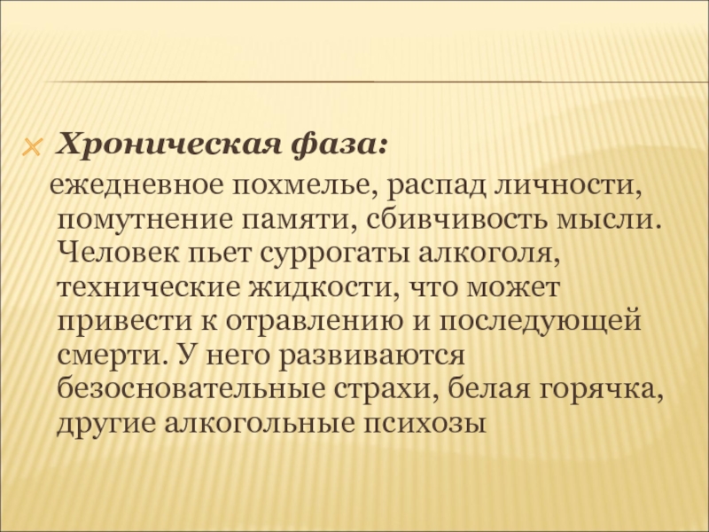 ежедневное похмелье, распад личности, помутнение памяти, сбивчивость