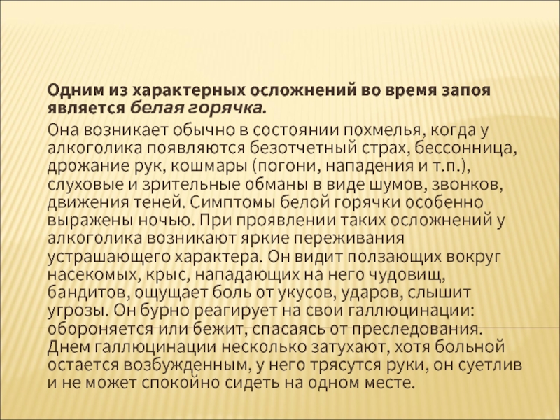 возникает обычно в состоянии похмелья, когда у алкоголика появляются безотчетный страх, бессонница, дрожание рук, кошмары (погони, нападения и т.п.), слуховые и зрительные обманы в виде шумов, звонков, движения теней. Симптомы белой горячки особенно выражены ночью. При проявлении таких осложнений у алкоголика возникают яркие переживания устрашающего характера. Он видит ползающих вокруг насекомых, крыс, нападающих на него чудовищ, бандитов, ощущает боль от укусов, ударов, слышит угрозы. Он бурно реагирует на свои галлюцинации: обороняется или бежит, спасаясь от преследования. Днем галлюцинации несколько затухают, хотя больной остается возбужденным, у него трясутся руки, он суетлив и не может спокойно сидеть на одном месте.