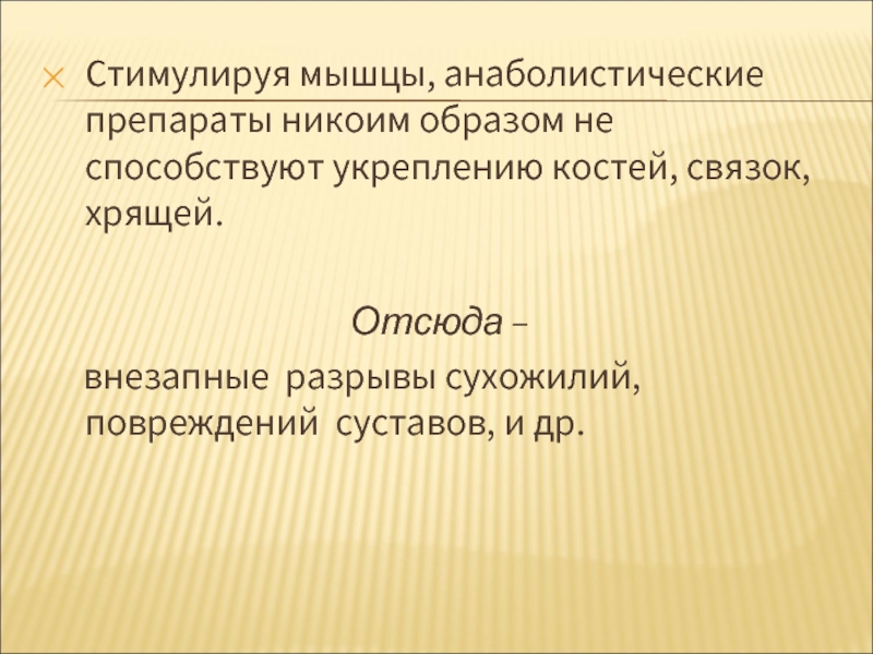 Слайд 73Стимулируя мышцы, анаболистические препараты никоим образом не способствуют укреплению костей, связок,