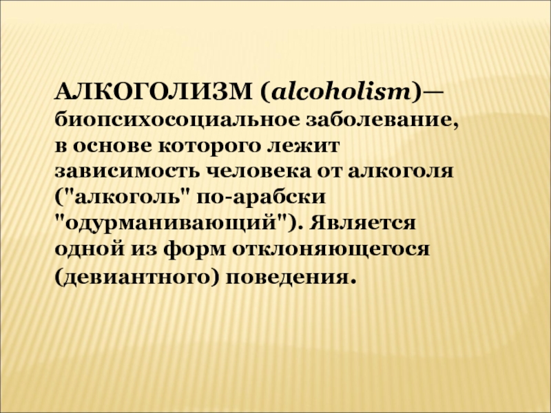 Слайд 16АЛКОГОЛИЗМ (alcoholism)— биопсихосоциальное заболевание,