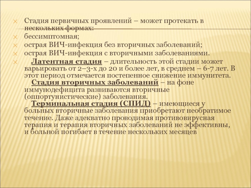 Латентная стадия – длительность этой стадии может варьировать от 2–3-х до 20 и более лет, в среднем – 6-7 лет. В этот период отмечается постепенное снижение иммунитета.