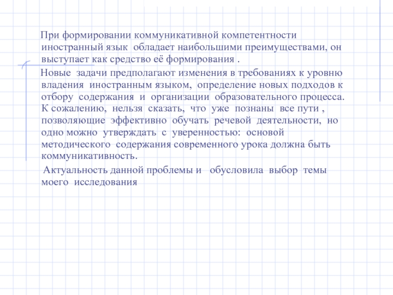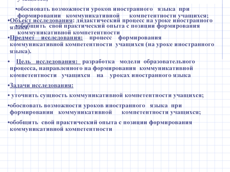 Предмет исследования: процесс формирования коммуникативной компетентности учащихся (на уроке иностранного языка).