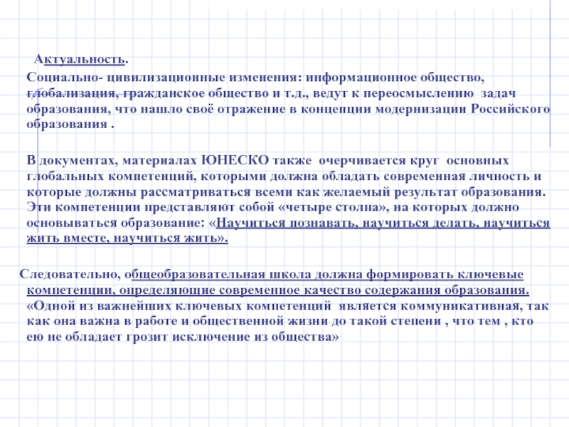 информационное общество, глобализация, гражданское общество и т.д., ведут к переосмыслению задач образования, что нашло своё отражение в концепции модернизации Российского образования .