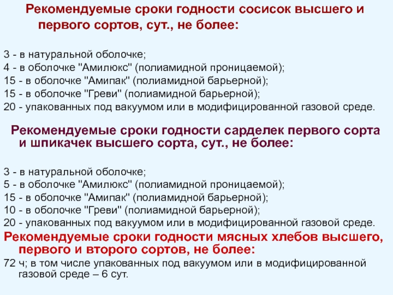 Рекомендуемые сроки годности сарделек первого сорта и шпикачек высшего сорта, сут., не более: