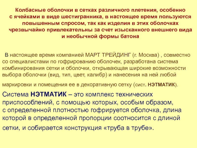В настоящее время компанией МАРТ ТРЕЙДИНГ (г. Москва) , совместно со специалистами по гофрированию оболочек, разработана система комбинирования сетки и оболочки, открывающая широкие возможности выбора оболочки (вид, тип, цвет, калибр) и нанесения на ней любой маркировки и помещения ее в декоративную сетку (сист. НЭТМАТИК).