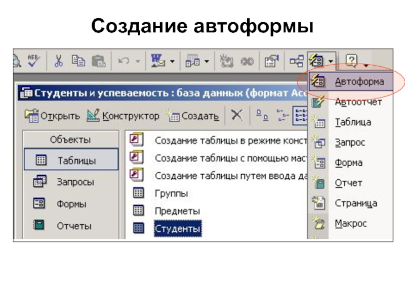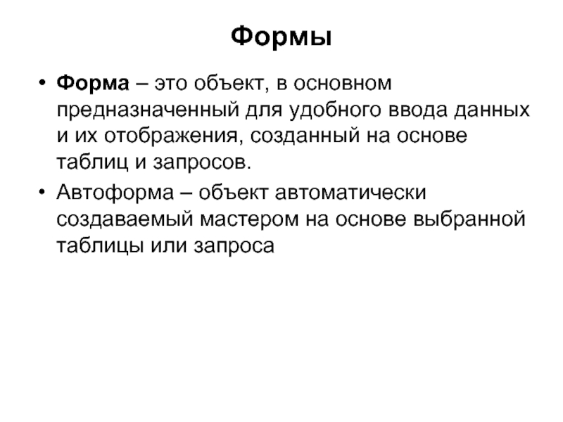 Автоформа – объект автоматически создаваемый мастером на основе выбранной таблицы или запроса