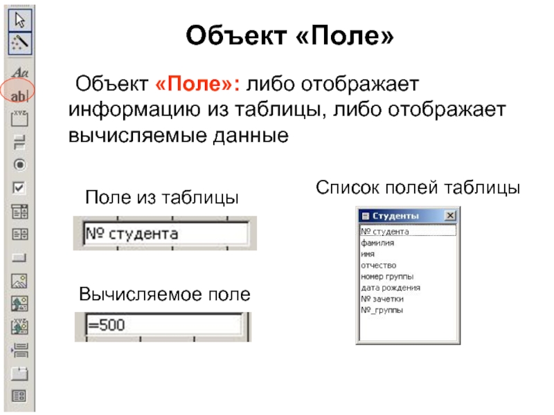 Объект «Поле»: либо отображает информацию из таблицы, либо отображает вычисляемые