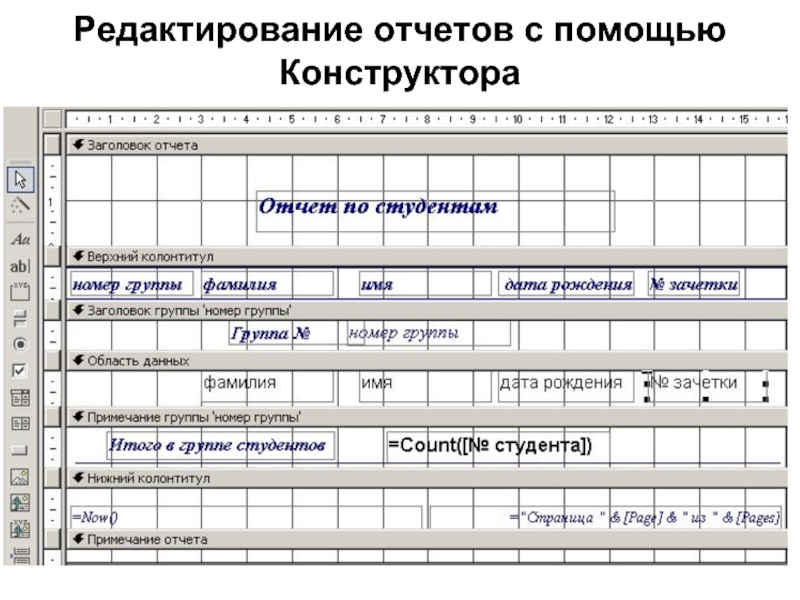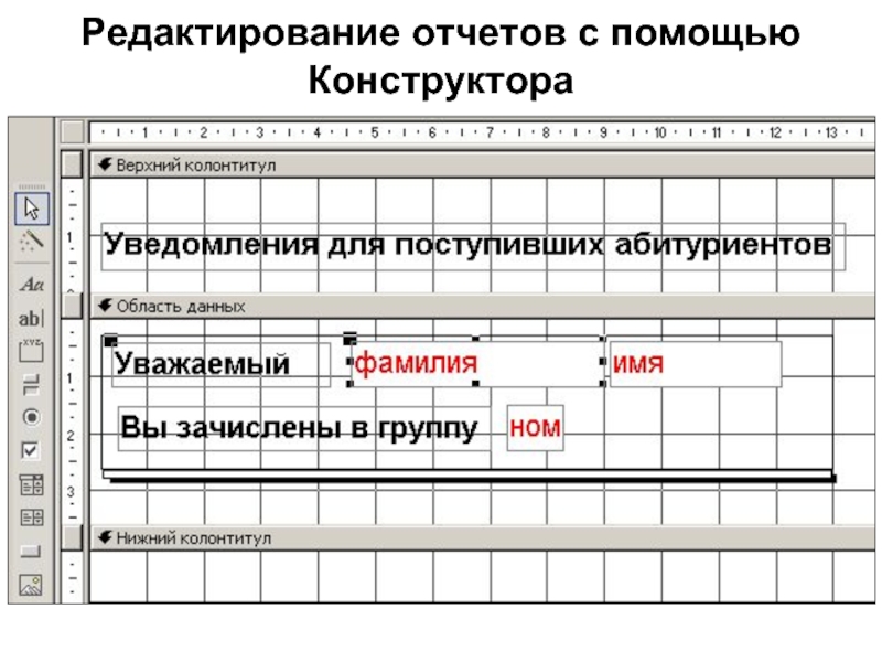 Слайд 32Редактирование отчетов с помощью Конструктора