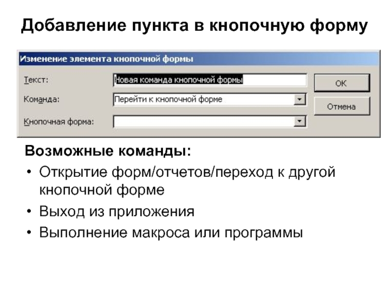 Слайд 24Добавление пункта в кнопочную форму
