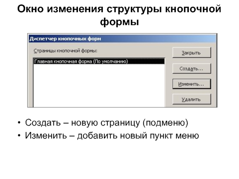 Слайд 22Окно изменения структуры кнопочной формы