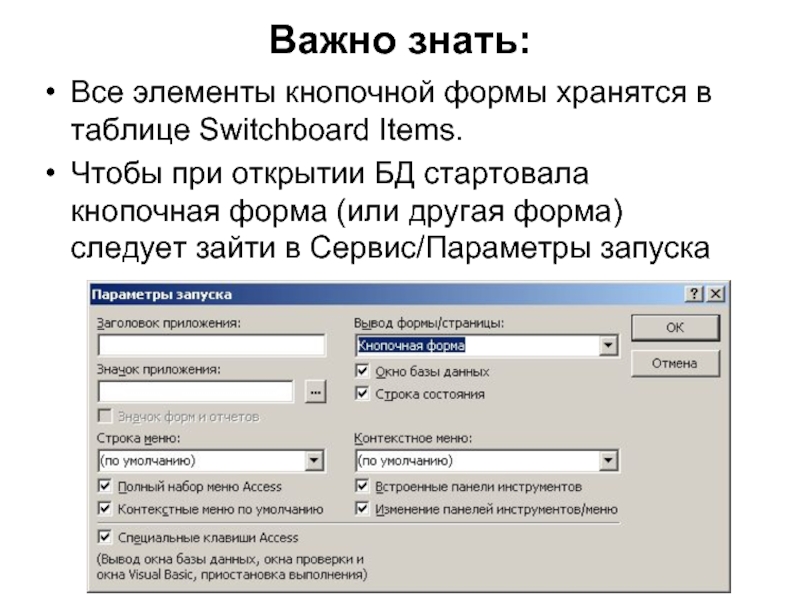 открытии БД стартовала кнопочная форма (или другая форма) следует зайти в Сервис/Параметры запуска