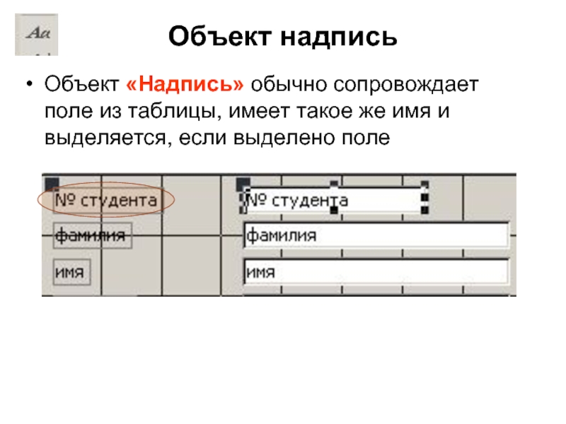 Объект «Надпись» обычно сопровождает поле из таблицы, имеет такое же
