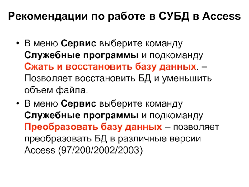 Слайд 27Рекомендации по работе в СУБД в Access