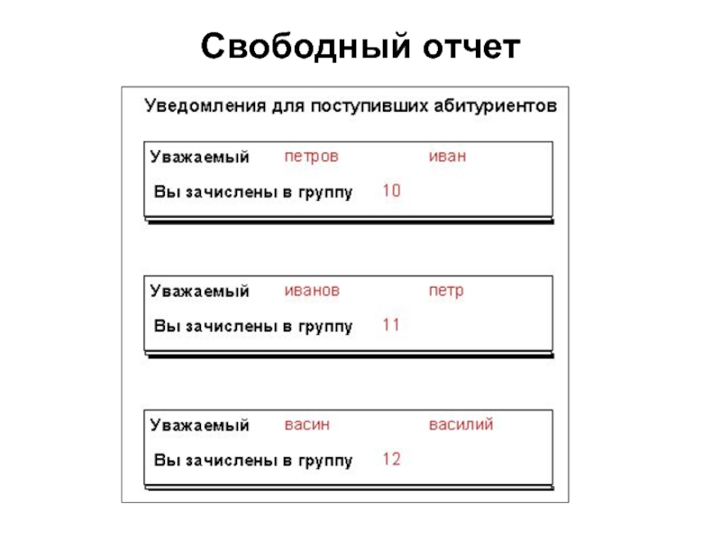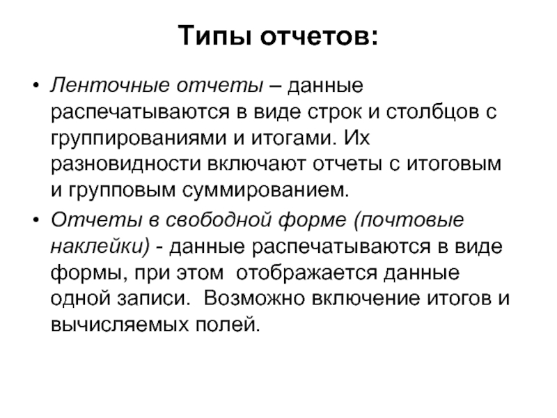Отчеты в свободной форме (почтовые наклейки) - данные распечатываются в виде формы, при этом отображается данные одной записи. Возможно включение итогов и вычисляемых полей.