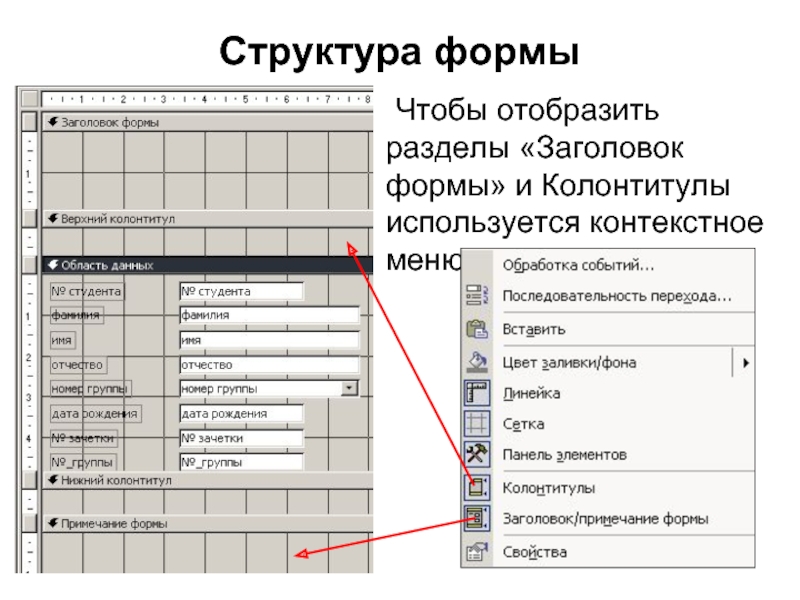 Чтобы отобразить разделы «Заголовок формы» и Колонтитулы используется контекстное меню
