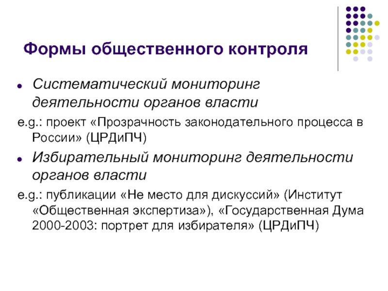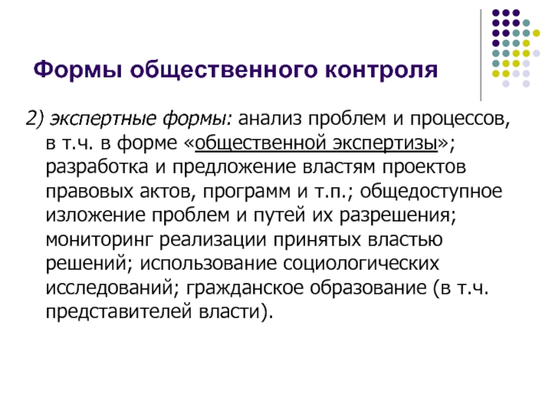 в форме «общественной экспертизы»; разработка и предложение властям проектов правовых актов, программ и т.п.; общедоступное изложение проблем и путей их разрешения; мониторинг реализации принятых властью решений; использование социологических исследований; гражданское образование (в т.ч. представителей власти).