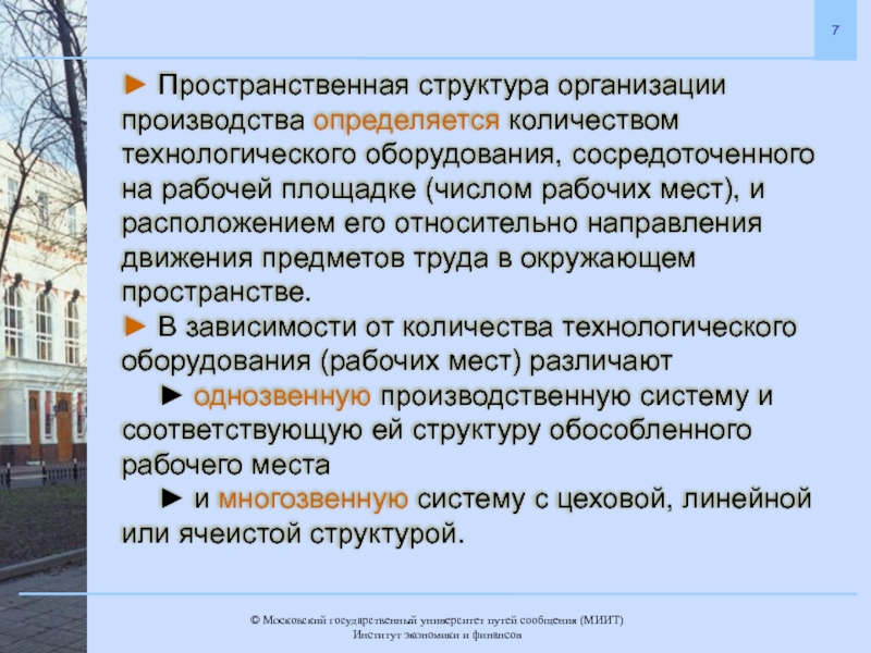 Слайд 7► Пространственная структура организации производства определяется количеством технологического оборудования, сосредоточенного на