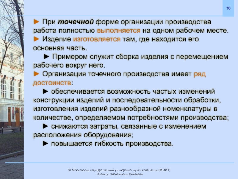 Слайд 16► При точечной форме организации производства работа полностью выполняется на одном