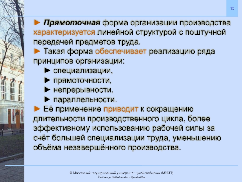 Слайд 15► Прямоточная форма организации производства характеризуется линейной структурой с поштучной передачей
