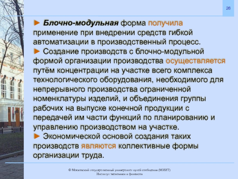 ► Создание производств с блочно-модульной формой организации производства осуществляется путём концентрации на участке всего комплекса технологического оборудования, необходимого для непрерывного производства ограниченной номенклатуры изделий, и объединения группы рабочих на выпуске конечной продукции с передачей им части функций по планированию и управлению производством на участке.