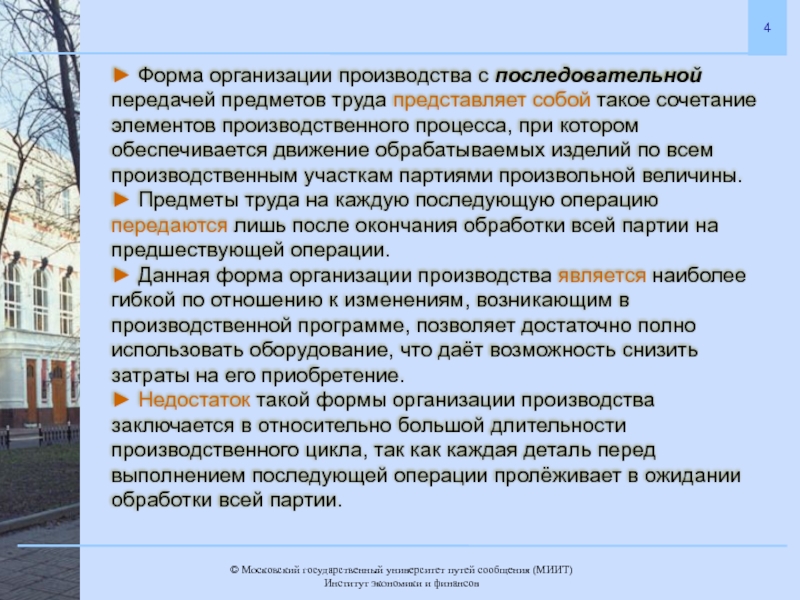Слайд 4► Форма организации производства с последовательной передачей предметов труда представляет собой