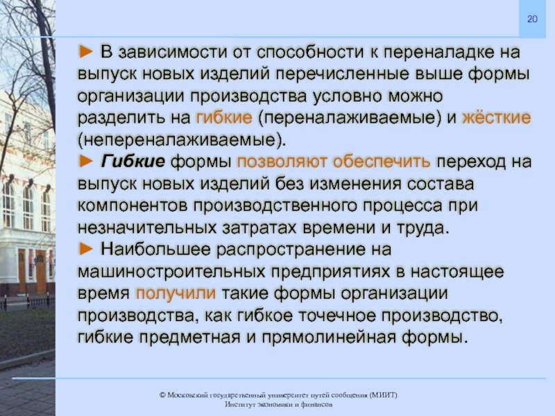 ► Наибольшее распространение на машиностроительных предприятиях в настоящее время получили такие формы организации производства, как гибкое точечное производство, гибкие предметная и прямолинейная формы.