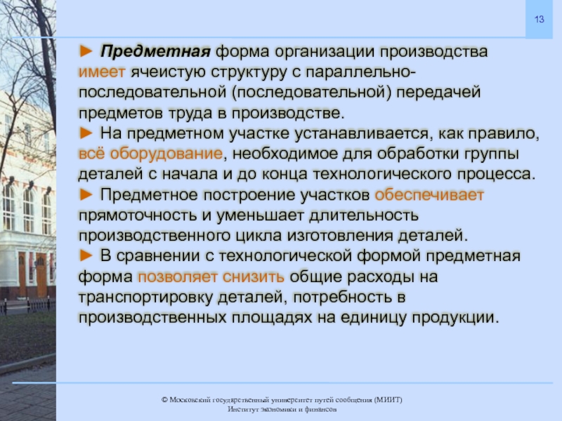 Слайд 13► Предметная форма организации производства имеет ячеистую структуру с параллельно-последовательной (последовательной)