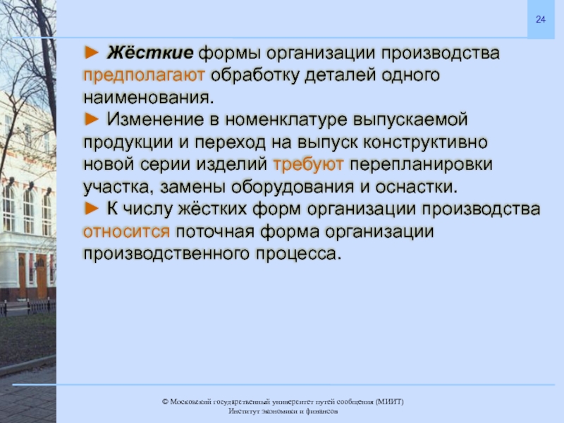 Слайд 24► Жёсткие формы организации производства предполагают обработку деталей одного наименования.